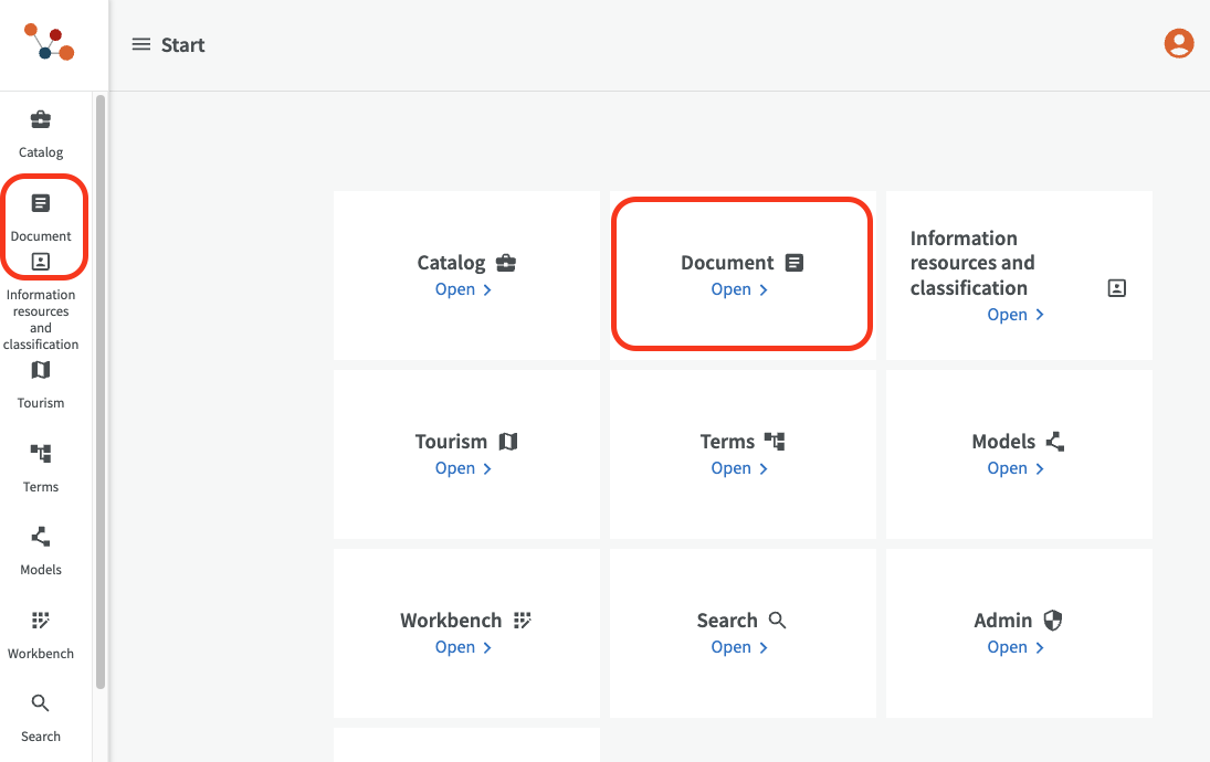 It is possible to get customizable project modules at the top level, instead of going through Workbench. Examples of project modules could be “Documents,” and “Tourism” with customized application profiles and metadata fields. EntryScape can be configured with this functionality for users when needed.