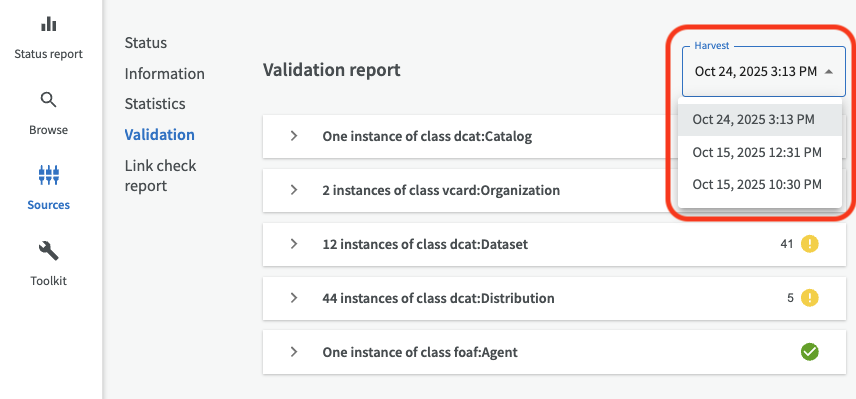 Registry has been upgraded and made more user-friendly with name changes, more intuitive navigation, and new features. For example, there is a new validation page for your harvest source, where you can easily switch between the three most recent validation reports via a drop-down menu.